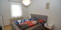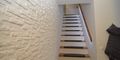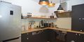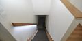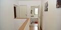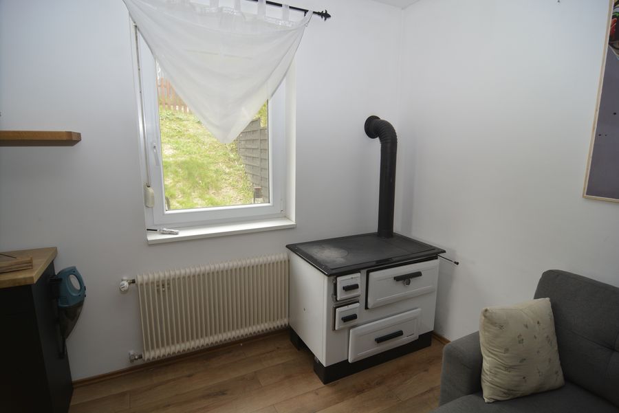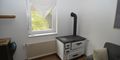 Obergeschoss: Moderner, offener Wohnbereich mit hochwertiger Küche und Holzofen, Diele, Badezimmer und zwei Zimmer.