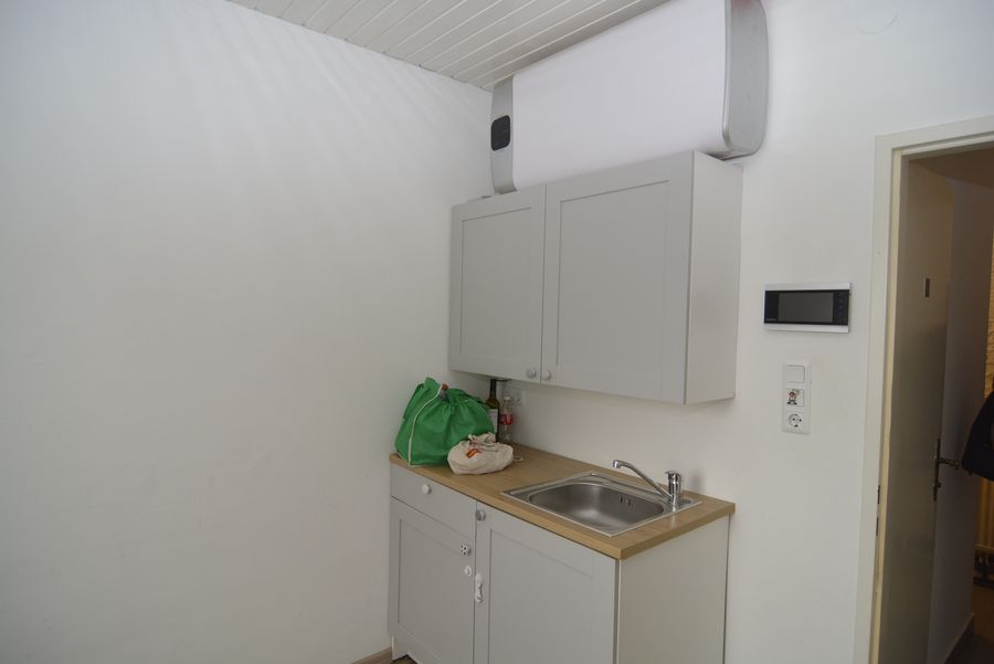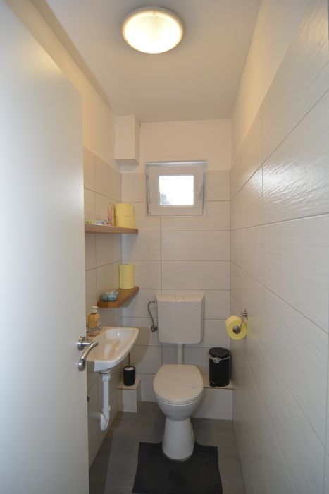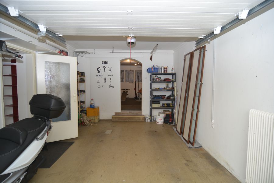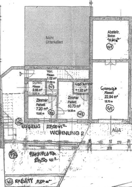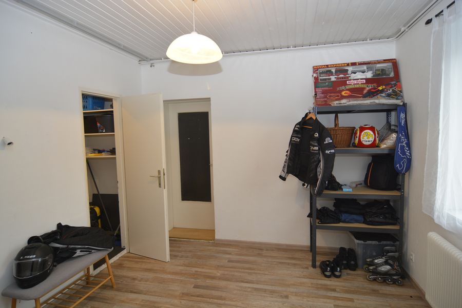 Erdgeschoss: Vorraum, Wohnküche, Zimmer mit kleinem Raum für Waschmaschine, Garage und Kellerraum.