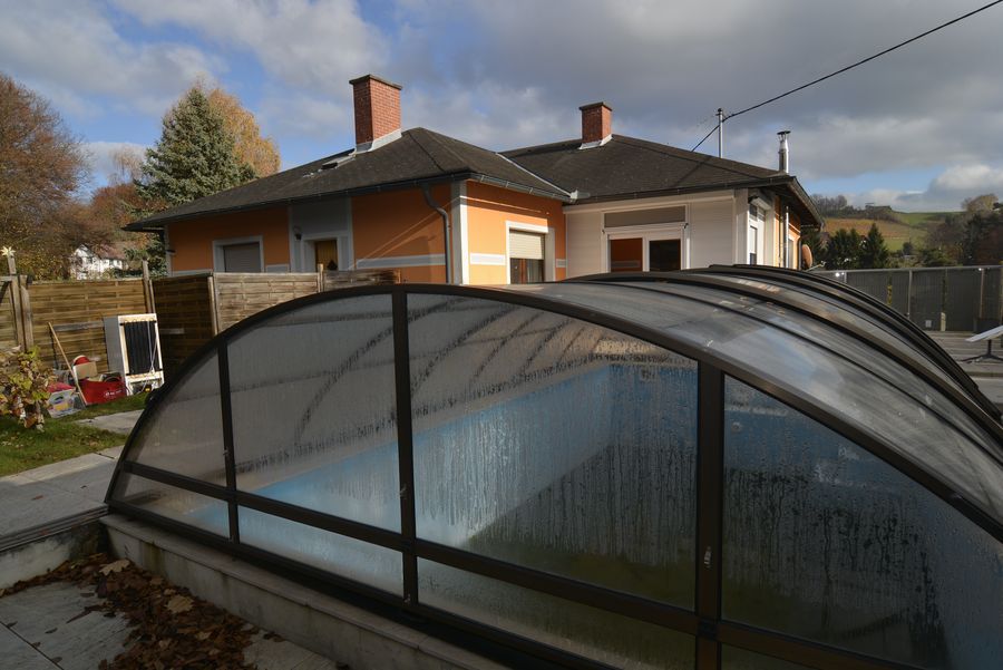 Ein uneinsichtiger Pool (ca. 28 m²) mit Gegenstromanlage, ein gemütliches Saunahaus und ein großzügiger Parkplatz sorgen für Entspannung und Komfort.